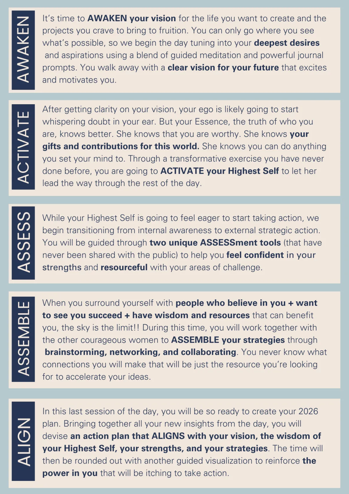 A thoughtfully crafted gift bag to inspire and support your journey in 2026 based on the five themes of the day Awaken, Activate, Assess, Assemble, and Align.